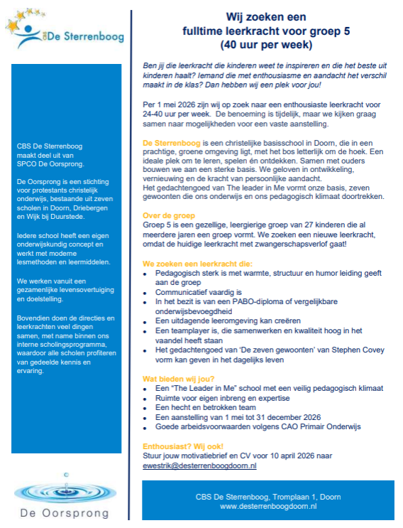 Op dit moment hebben wij een vacature voor groep 5! Bekijk de vacature via deze link.